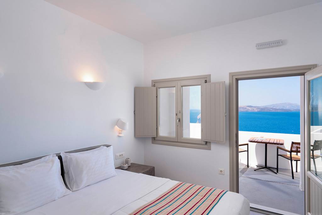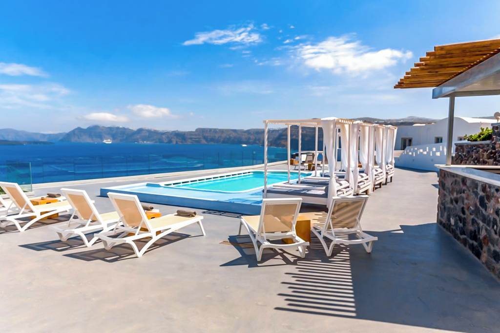The Goulielmos Hotel is a small and friendly family-run hotel, offering stunning views of the Caldera. The rooms are spacious and modern, decorated in a fresh, contemporary style. There’s a boutique, peaceful atmosphere throughout making this perfect for couples seeking lazy days on a Bali bed around the pool and laid-back evenings in the on-site restaurant.