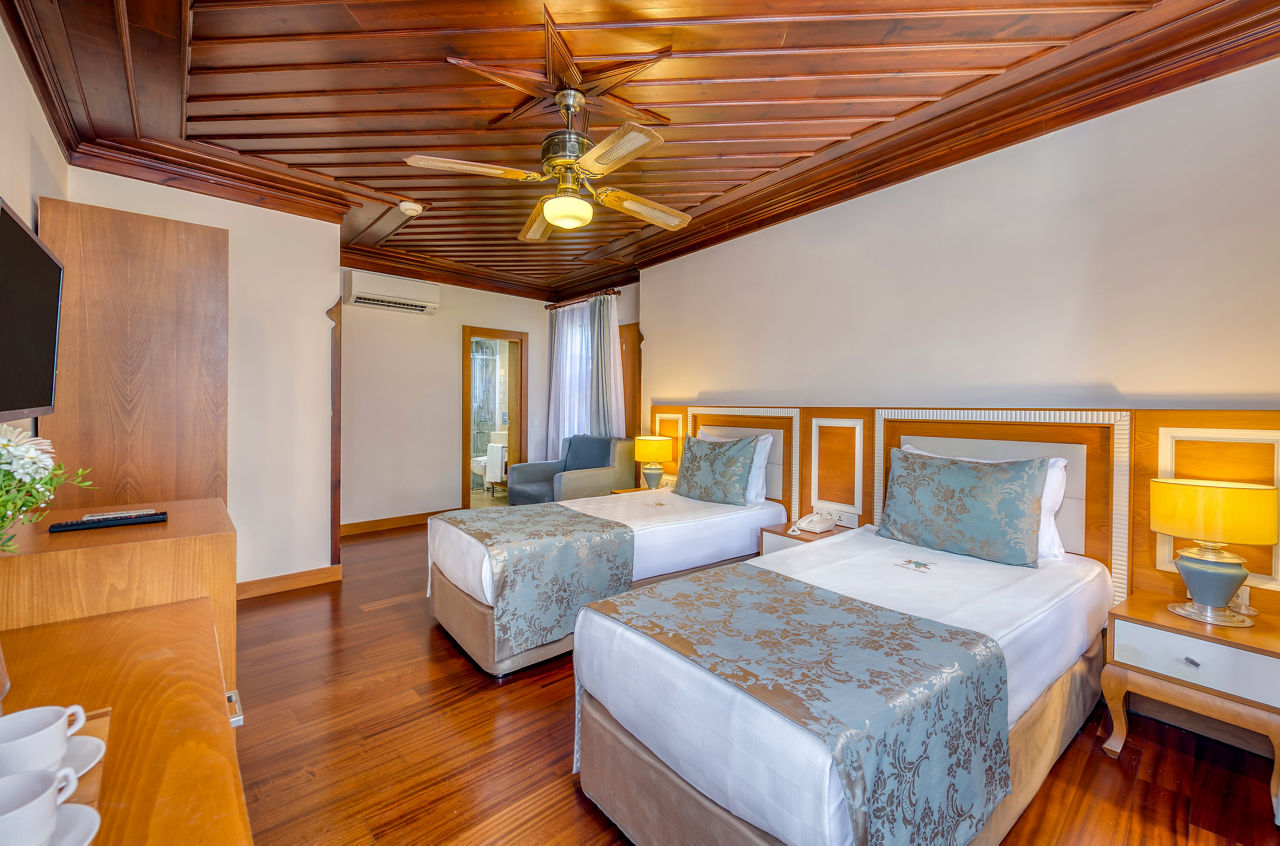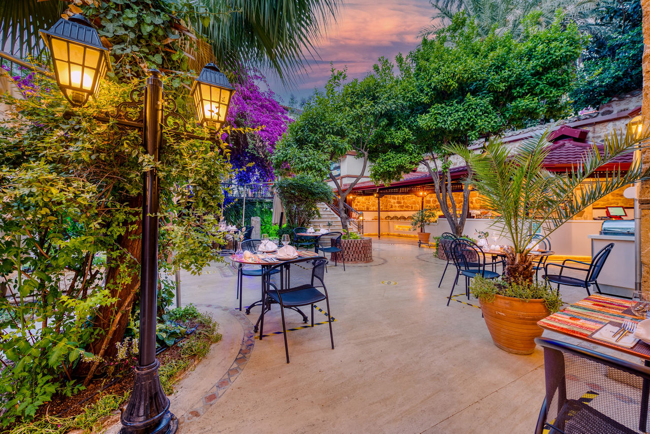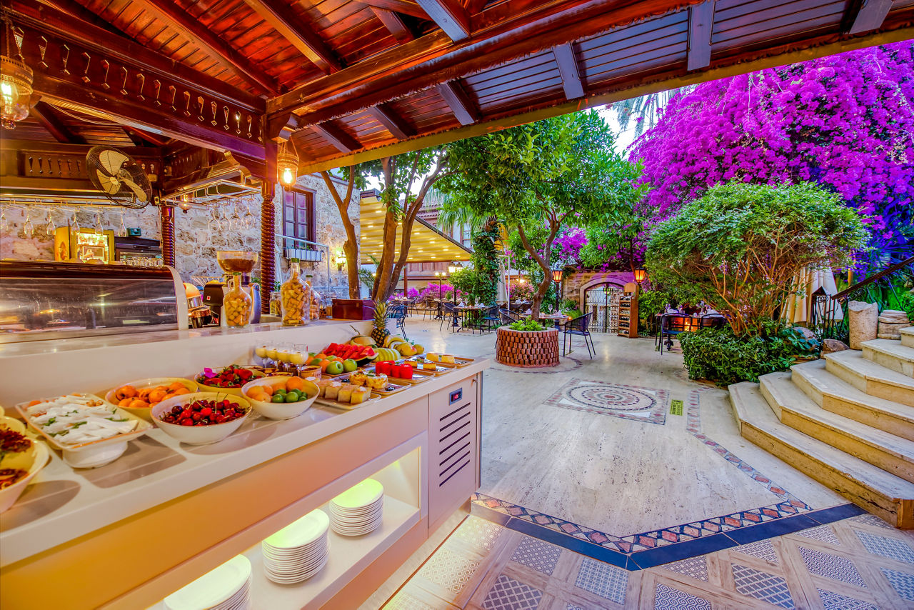 At Dogan Hotel, you’ll relax among charming courtyards and traditional Turkish Ottoman-style décor. Characterful rooms feature beautiful Turkish bedspreads, adding to that authentic feel. Breakfast, lunch and dinner are all served at the on-site restaurant. Here, you’ll be able to sample some traditional Turkish cuisine too. The pool area is an oasis, draped with colourful flowers and dotted with comfortable sunloungers – perfect for relaxing after a day exploring Kaleici. Hadrian’s gate, the beach and the Old City Marina are all just a stone’s throw away from this small and welcoming haven, making it an excellent base.