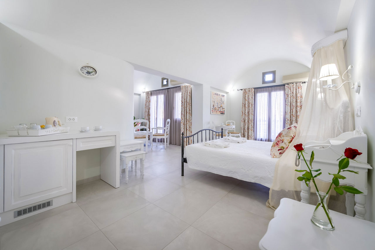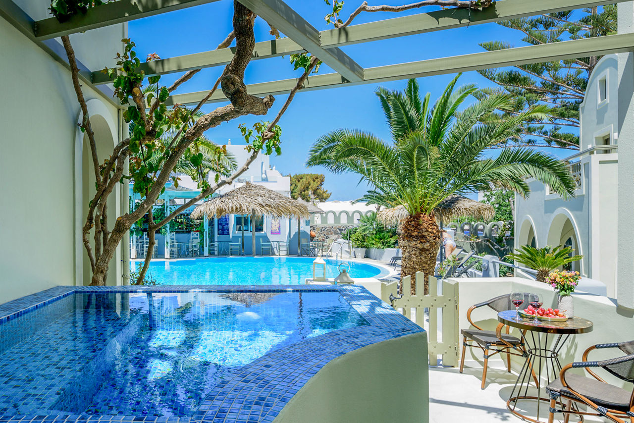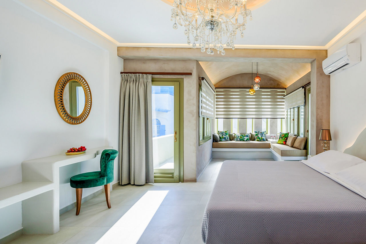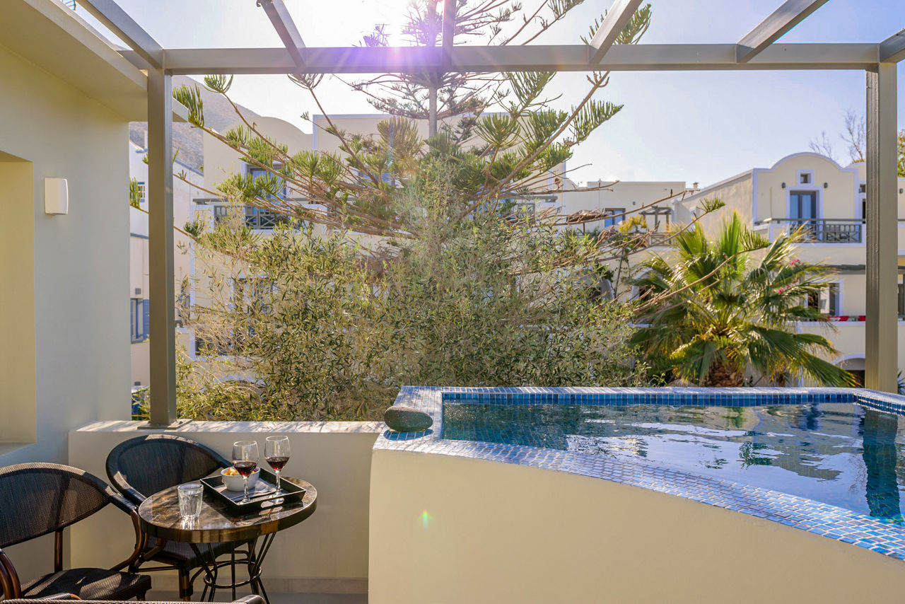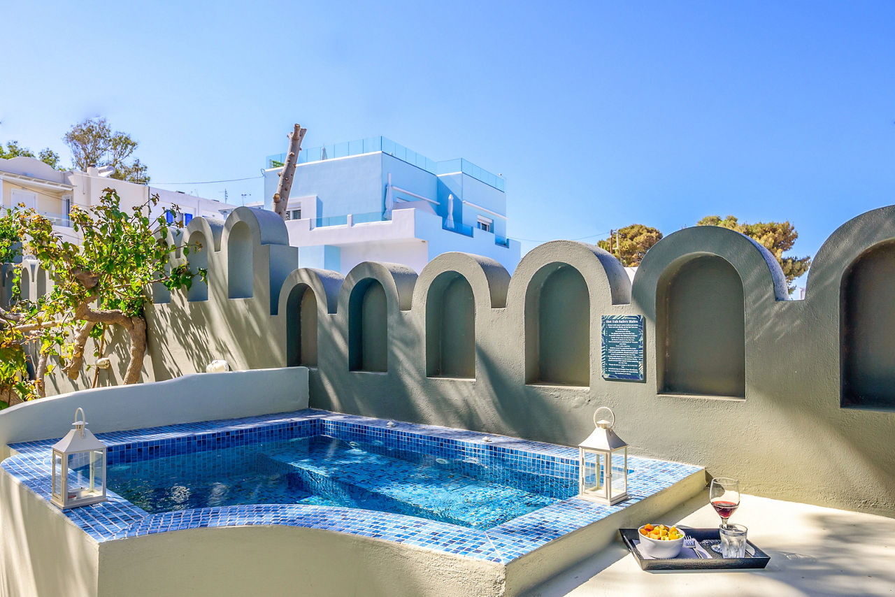 This family-run hotel makes you feel right at home during your stay. Decorated in true Santorini style, with whitewashed walls and pops of blue everywhere you turn, the charm of Zephyros Hotel Santorini is undeniable. Relax in the delightfully decorated, spacious rooms in between trips to the peaceful pool area. The hotel is in the ideal location too, being only a short stroll from the bustling beachfront of Kamari, where shops and tavernas line the black sands. It’s also only a short trip to visit the historic site, Ancient Thera. Those looking for a charming, peaceful getaway to the picture-perfect Santorini will love it here.