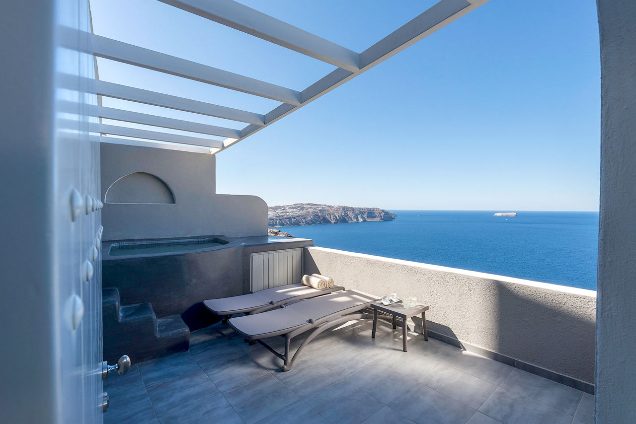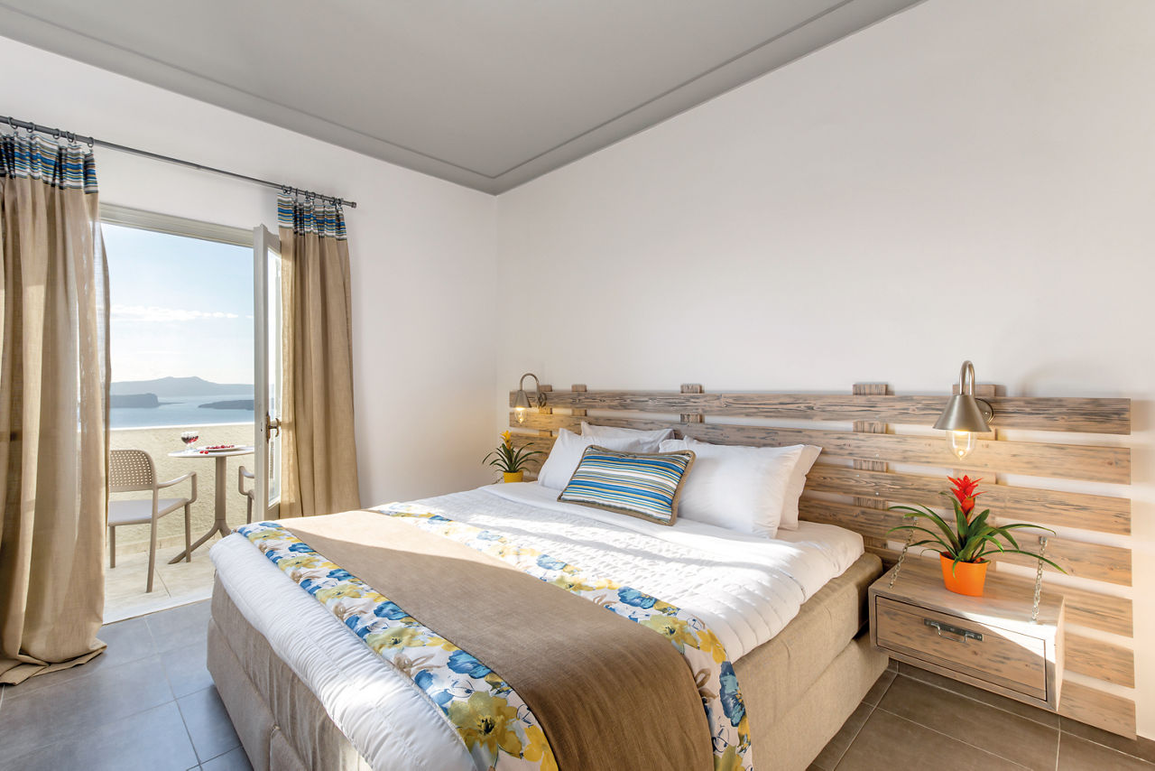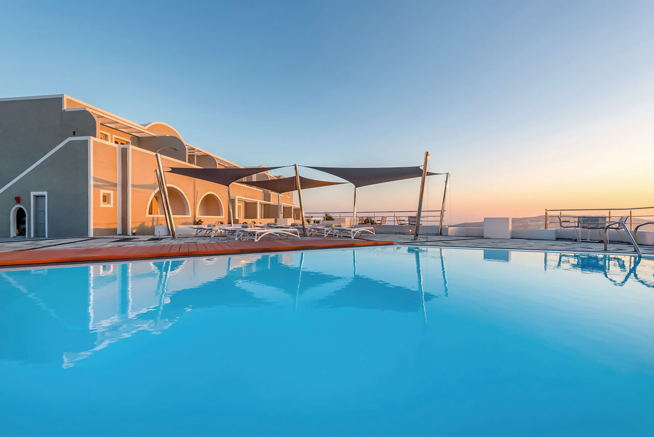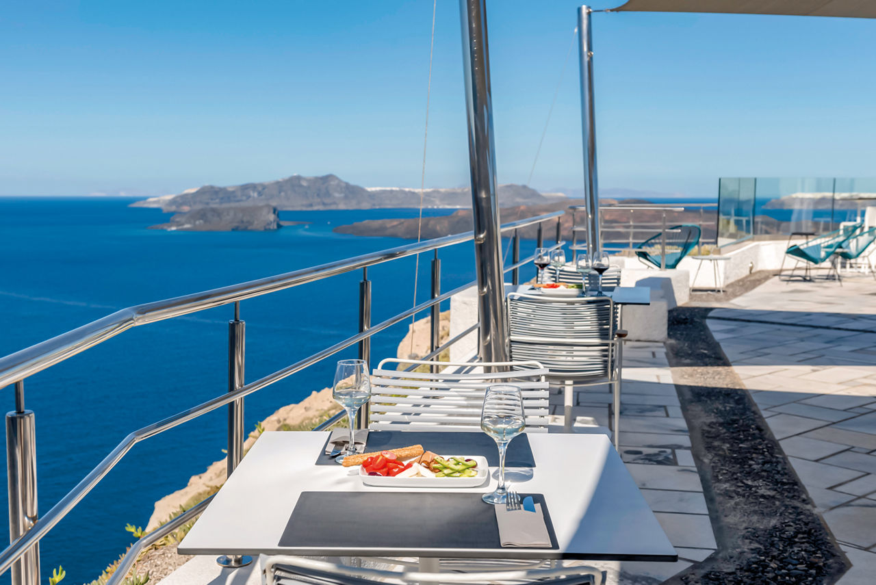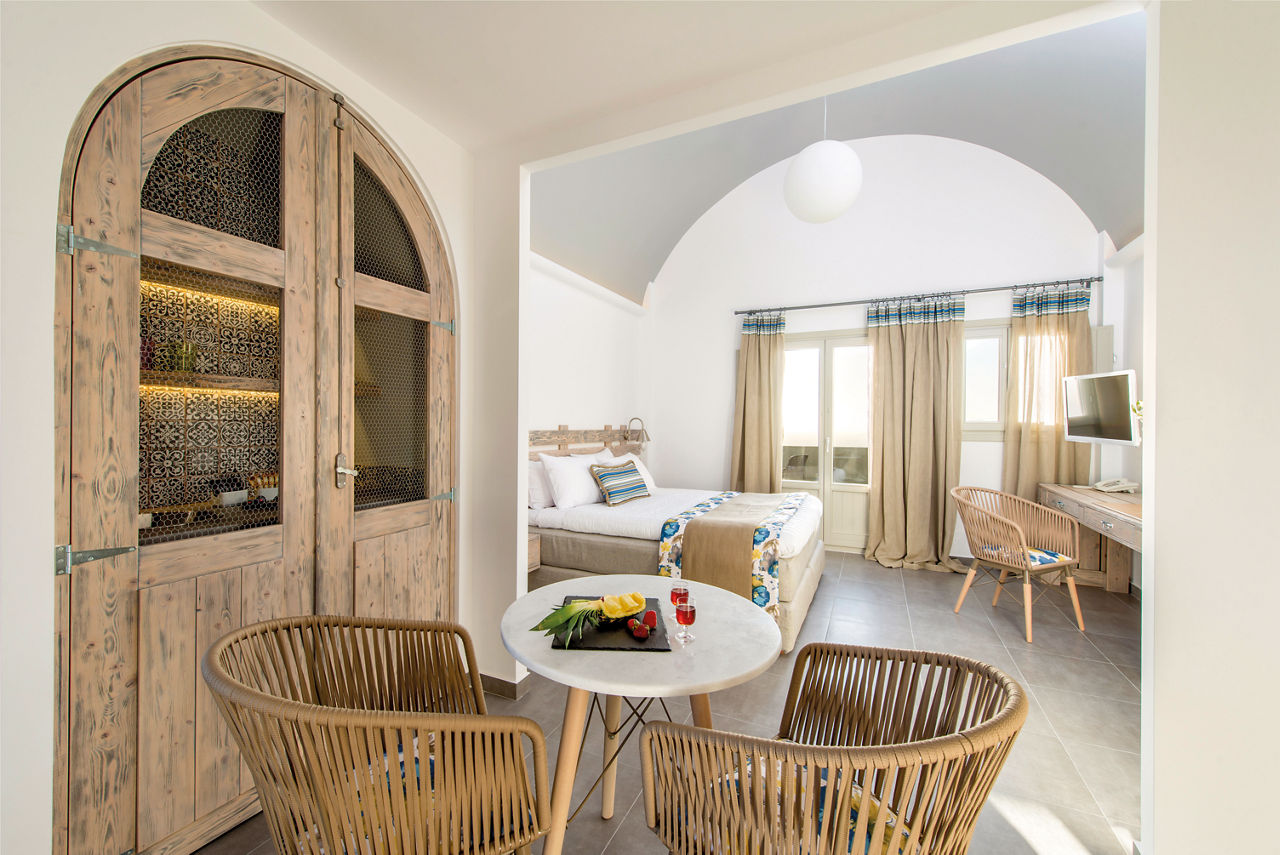 Fresh, bright décor characterises the design of Caldera's Dolphin, a luxurious hotel situated in a stunning clifftop location – as its name suggests – overlooking the caldera. From the outdoor pool and spacious sun terrace, you’ll have incredible views of the sun-soaked landscape and seafront. The à la carte restaurant is on the same panoramic platform. As you’ll be on the west coast of Santorini, you can expect spectacular sunsets to illuminate the evening sky. It’s also just a short journey to the charming village of Megalochori. Discover the local wineries and tavernas, or head north to enjoy the bigger selection of shops in Thira.