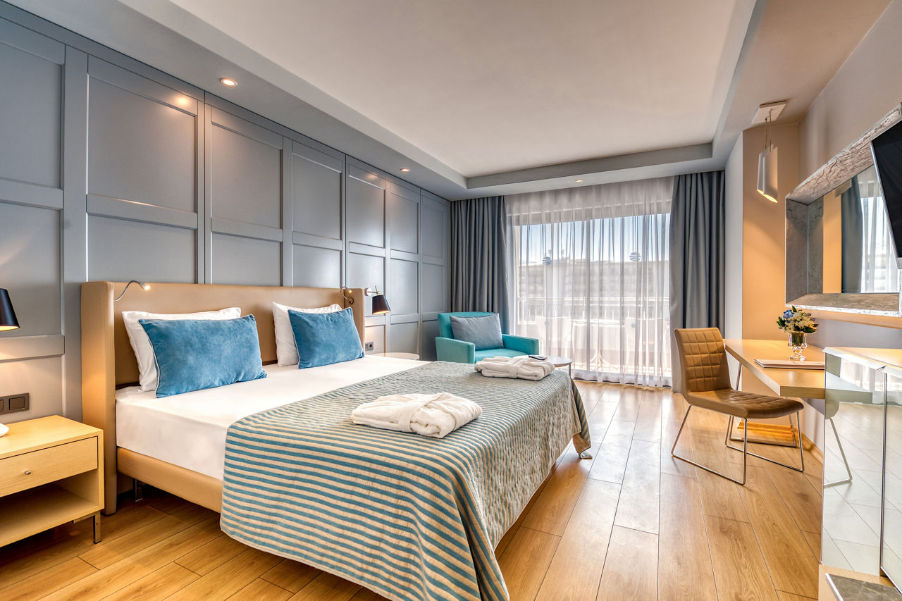 Stylish and modern throughout, the Numa Bay Exclusive Hotel leads directly onto the beachfront where you’ll find the hotel’s own private beach area. Rooms here are fresh and bright with cool blue tones and tasteful design, and from Summer 2026 selected room types, pool areas, and some surrounding areas of the hotel will feature newly renovated designs. With a great All Inclusive Plus package, you’ll have plenty of food and drink options to keep you refreshed and your appetite satisfied, including several à la carte restaurants for even more variety. If you’re travelling with little ones, there’s a children’s pool with small slides and a mini-club to keep them entertained. When the sun goes down, a busy entertainment schedule keeps the fun going into the evening, and for those looking to relax, the on-site spa is the perfect place to unwind.