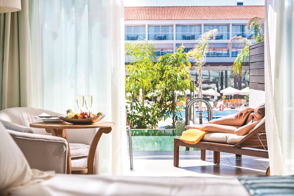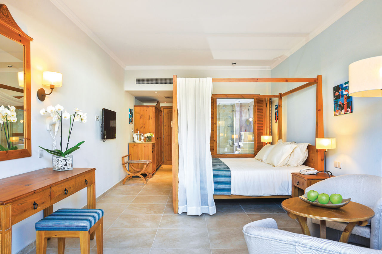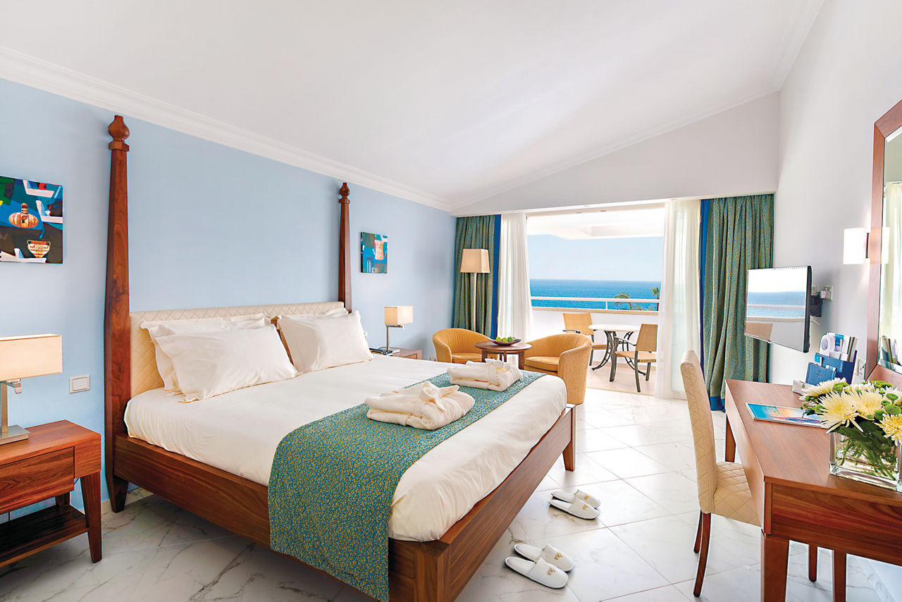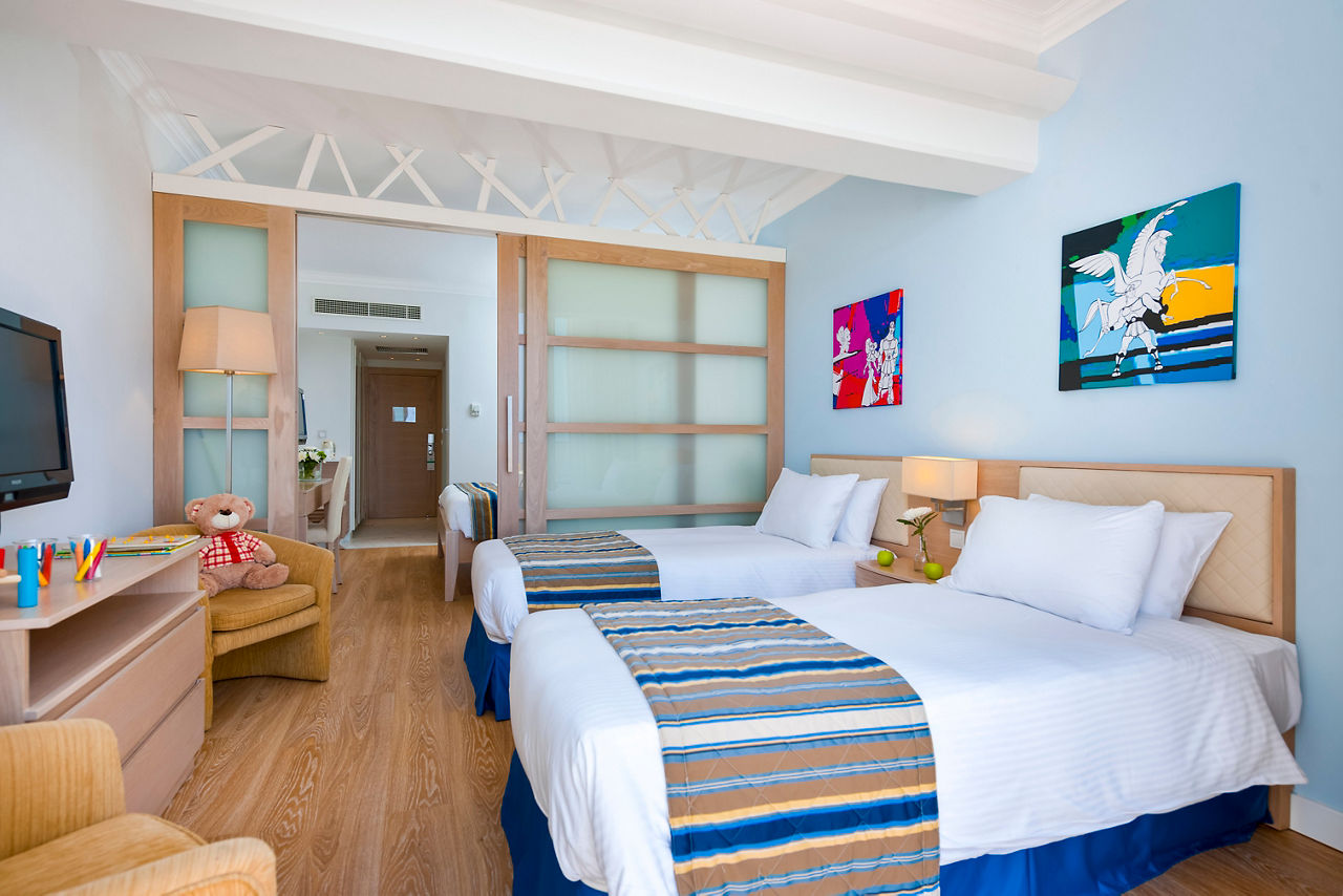 Deluxe rooms sleep up to 3 adults and have double or twin beds, bathroom containing a bath with shower attachment, air conditioning, hairdryer, flat screen television, mini-fridge stocked on arrival and a balcony or terrace. Deluxe rooms with Side Sea View, Deluxe rooms with Sea and Pool View, Superior rooms with Side Sea View sleeping up to 2 adults, Superior rooms with Sea and Pool View, Family Junior suites sleeping up to 4 adults and 1 child or 2 adults and 3 children, Family Junior suites with Sea and Pool View, Fisherman’s Village rooms with Private Garden sleeping up to 2 adults (adult only), Fisherman’s Village rooms with Sea and Pool View (adult only), Fisherman’s Village rooms with Private Pool (adult only), Honeymoon suites and Deluxe rooms with Side Sea View for Sole Use are also available. Please note: all rooms have tea and coffee making facilities and Superior rooms, Fisherman’s Village rooms, and Honeymoon suites all have bathrobes and slippers in the rooms.