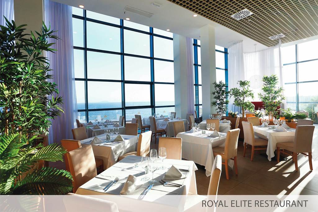 Royal Elite Restaurant. Buffet. Serves breakfast and dinner with show cooking. Highchairs available. Please note that the hotel requests that beach wear is not worn.