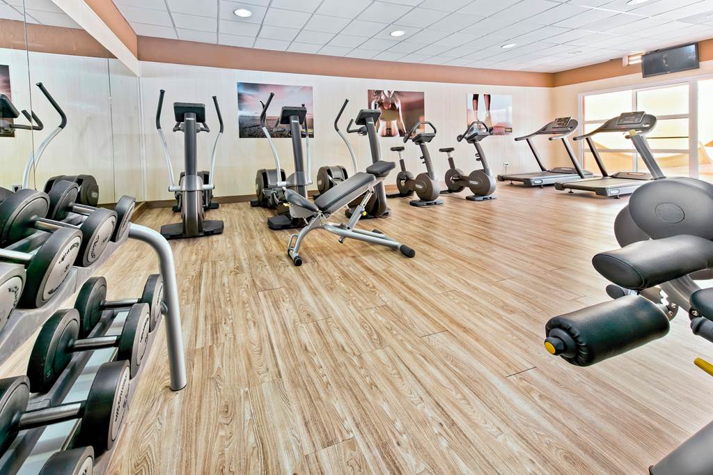 Gym with cardio fitness training equipment, free weights area, stretching zone, fixed strength equipment, sauna, steam room and whirlpool.