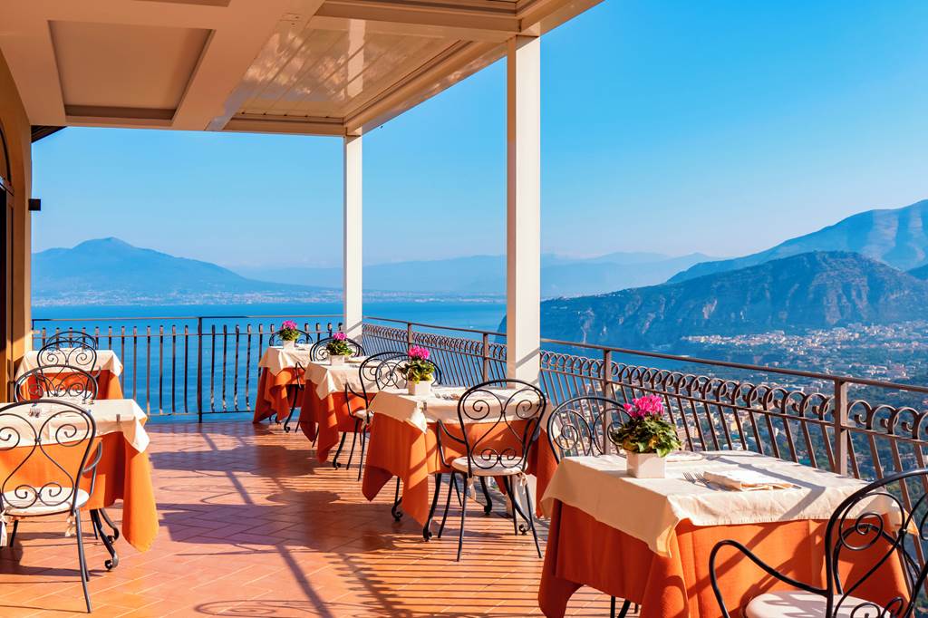 The charming Hotel La Vue D'Or sits peacefully among the hills on the outskirts of Sorrento, offering a serene escape with breathtaking panoramic views of the coastline and surrounding mountains. Guests can unwind on the sun-drenched roof terrace, which features a sparkling swimming pool lined with sun loungers and a bar; perfect for enjoying a refreshing aperitif as the sun sets. The hotel is an excellent choice for a relaxing retreat while providing easy access to the vibrant Sorrento resort centre.